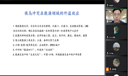 讲座伊始,连波老师介绍了俄乌冲突可能在能源领域产生的六个外溢效应。首先,俄乌冲突后,欧盟对俄罗斯发动了8轮制裁,与此同时,自身也深陷能源危机,欧盟能源领域的安全化问题日益突出,并逐步造成安全化困境。欧盟通过“确认存在性威胁、采取紧急行动、打破常规予以应对”三步实现LNG安全化过程。其次,俄乌冲突也使欧盟内部的政策分裂日趋明显,波罗的海三国、波兰、匈牙利、捷克、奥地利和德国等国针对欧盟制裁俄罗斯提出不同程度的反对意见。此外,由于俄乌冲突,俄土欧能源三角关系、沙特-美国-俄罗斯关系发生了新的变化。印度的“石油经”行为体现了“能源双11”现象。最后,中国与沙特、俄罗斯能源交易中的卢布结算倾向说明了能源交易过程中的“去美元化”现象。