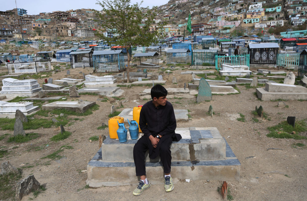 4月16日,一名男孩在阿富汗喀布尔一处墓地卖水。新华社发(拉赫马图拉·阿里扎达摄)