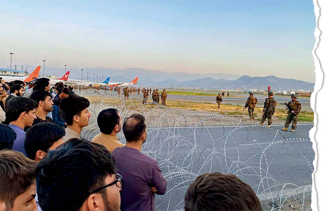 8月16日,在喀布尔机场,美军士兵用隔离带挡住阿富汗民众