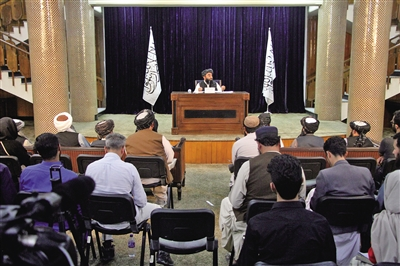 9月7日,阿富汗塔利班发言人穆贾希德在喀布尔出席记者会。穆贾希德在记者会上表示,塔利班决定组建临时政府,并公布了临时政府主要成员。新华社发(塞夫拉赫曼·萨菲摄)