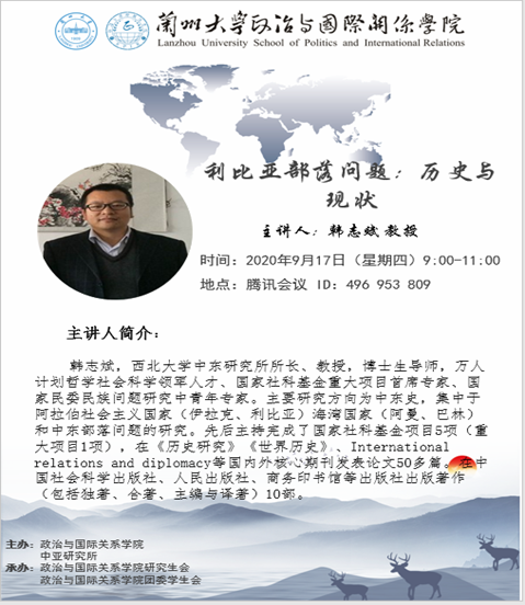 Invited by the School of Politics and International Relations of Lanzhou University and the Institute for Central Asian Studies of Lanzhou University, Professor Han Zhibin, Director of Institute of Middle Eastern Studies of Northwest University, will give an online academic lecture to teachers and students of the school.