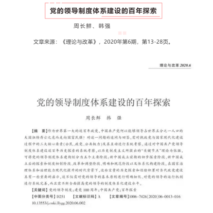Abstract: As the world's largest political Party in the recent 100 years, why can the Communist Party of China lead a large country that accounts for one-fifth of the world's population to reverse the danger of survival and become prosperous and strong? To answer this question, it is necessary to systematically investigate the interaction between the ruling party and the three core elements(citizens, political parties and public power) in the process of national modernization. Based on the "key node" theory put forward by historical institutionalism, the construction of the leadership system of the Party can be divided into five main stages: the initial exploration stage before the founding of New China, the exploration and system start-up stage after the founding of New China, the reform and adjustment stage, the clarification and standardization stage and the systematic construction stage. In the context of the modernization of national governance system and governance capacity, these precious historical explorations and accumulated experience have some important enlightenment for contemporary Party building. This not only needs to clarify and refine the basic principles of Party leadership, to systematically improve the operational mechanism of Party leadership, but also needs to continuously and comprehensively improve the systematic construction level of Party leadership.