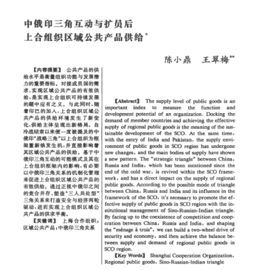 [Key Words]Shanghai Cooperation Organization, Regional public goods, Sino Russian Indian triangle